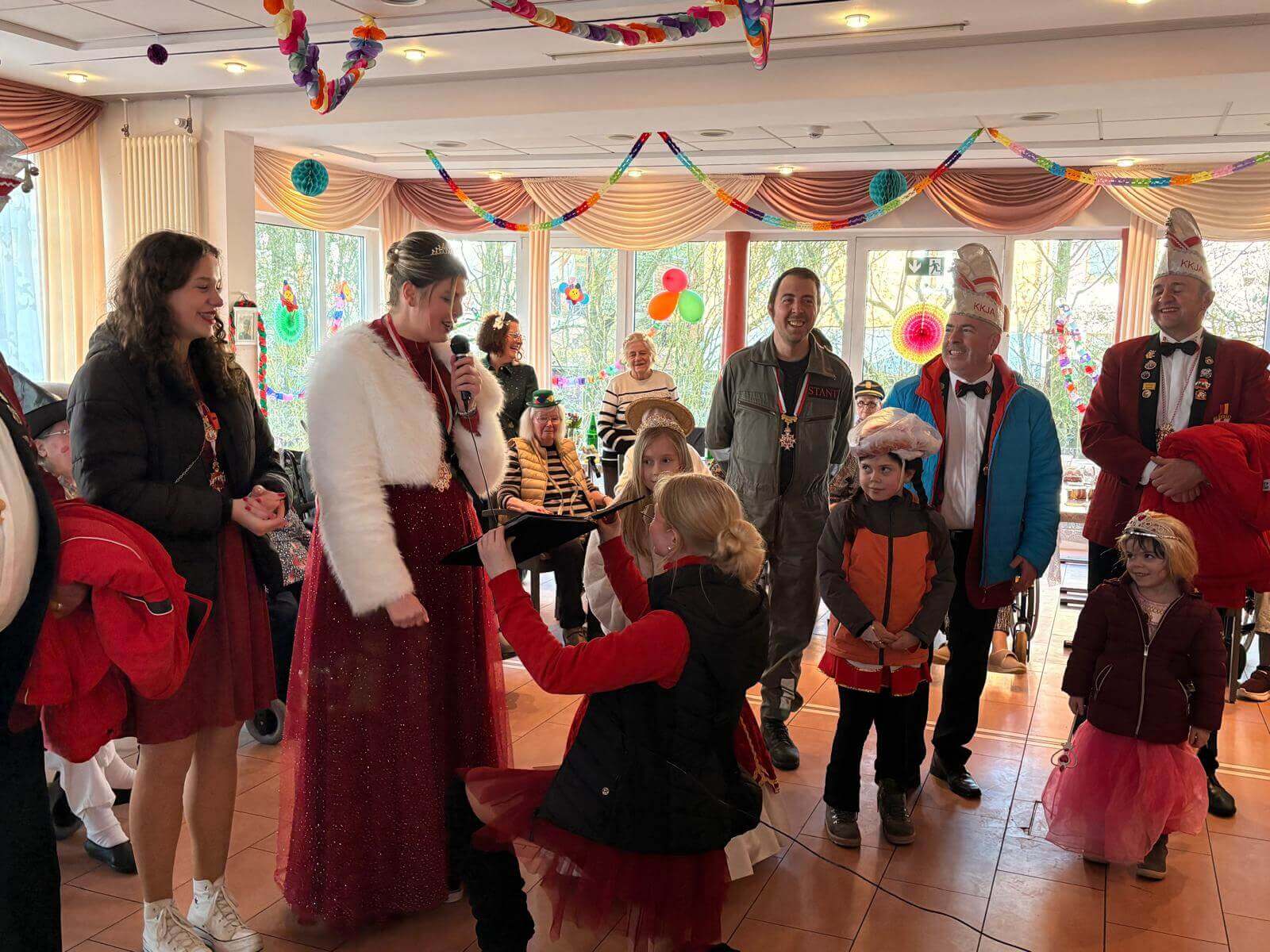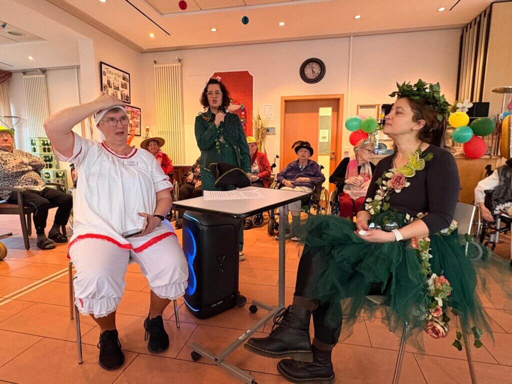 Pünktlich um 14:00 Uhr ging es bei uns im Saal los. Nachdem alle ihren Platz gefunden hatten, wurde direkt das erste Lied angestimmt. Es ist jedes Jahr wieder klasse zu sehen, wie textsicher unsere Bewohner bei den bekannten Schlagern und Faasend-Liedern sind – da braucht niemand ein Liederheft. Es wurde gelacht, geschunkelt und die Berliner haben natürlich auch nicht gefehlt.
